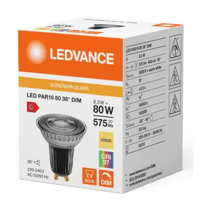 Puoi risparmiare fino al 90% tra il risparmio di energia e I costi di mantenimento grazie al basso consume di soli 8.3W e la lunga vita media utile di 40000 ore, comparandola invece con una lampada alogena GU10 con la sola durata di 2.000 ore. Inoltre le lampade LED non producono raggi IR e raggi UV dannosi per noi esseri umani tutto questo senza neanche produrre calore! Installarla è veramente semplice: ruotare la vecchia lampada GU10 di un quarto e rimuoverla dall’attacco. Successivamente inserire la lampada LED GU10 nell’attacco e girarla di un quarto per installarla. Questa è lampada di alta qualità Ledvance e parte da un prezzo di . Puoi usare questo prodotto come desideri grazie alla nostra garanzia totale di5 anni da Lampadadiretta.it.