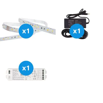 Il grande vantaggio di questo kit completo è che include tutti gli accessori necessari per installare il nastro LED a casa o in azienda. Vi forniamo il materiale necessario per installare il nastro LED. Poi si collega il tutto a una presa elettrica standard. Troverete tutte le informazioni necessarie nel nostro blog sull'installazione. Il kit comprende: