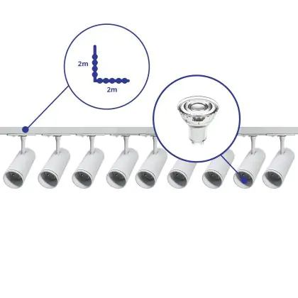 | Nome del fabbricante | Complete L shaped 1-Phase Track Set White incl. 9x Spot fixture + GU10 2700K 3W Dim – 2 x 2 meter i | |
